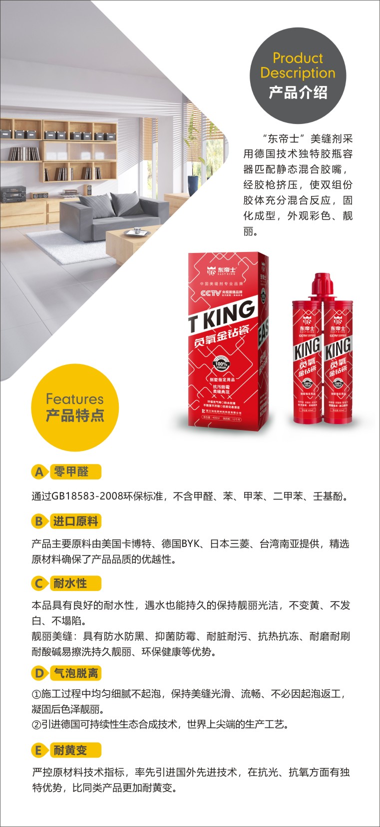 “東帝士”美縫劑采用德國技術(shù)獨特膠瓶容器匹配靜態(tài)混合膠嘴,經(jīng)膠槍擠壓,使雙組份膠體充分混合反應(yīng),固化成型,外觀彩色、靚麗。